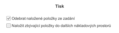 Pokud chcete naložit zbývající položky do jiného typu nákladového prostoru, neoznačujte možnost "Naložit zbývající položky do dalších nákladových prostorů" a ponechte označenou pouze první z možností, "Odebrat naložené položky ze zadání". V dalším kroku budete moci vybrat nákladový prostor podle potřeby.