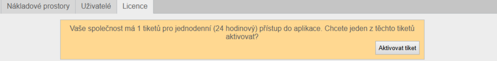 Pokud se uživatel přihlásí do aplikace a nemá přiřazenou licenci, systém mu ji v případě, že má společnost volnou licenci, automaticky přiřadí. Pokud nemáte žádnou volnou aktivní licenci, ale máte k dispozici tikety, systém se uživatele zeptá, zda chce tento jednodenní tiket aktivovat.